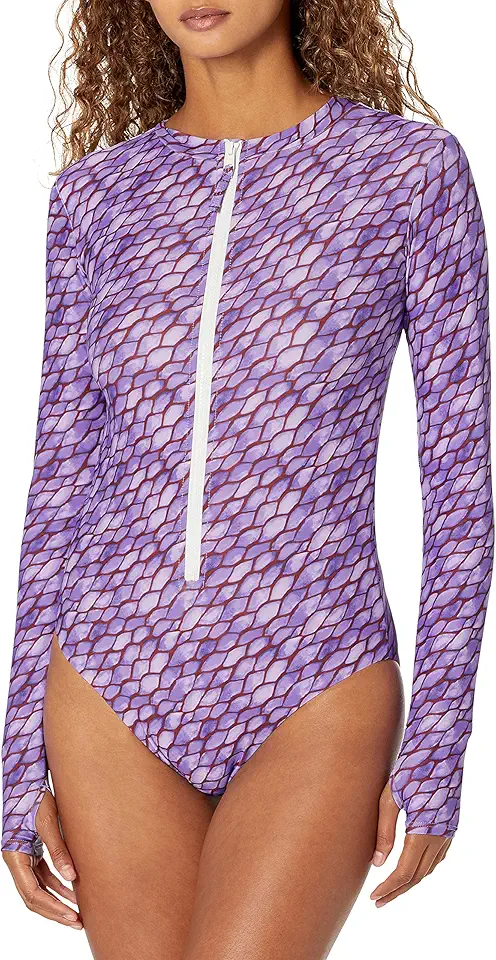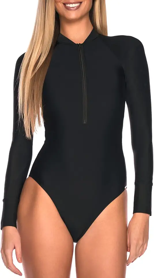 Womens Rash Guard Long Sleeve One Piece Swimsuit Ruched Zip Bathing Suit combines sun-safe coverage, adjustable zip front, and ruched detailing—stylish and functional for active water days.